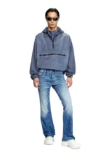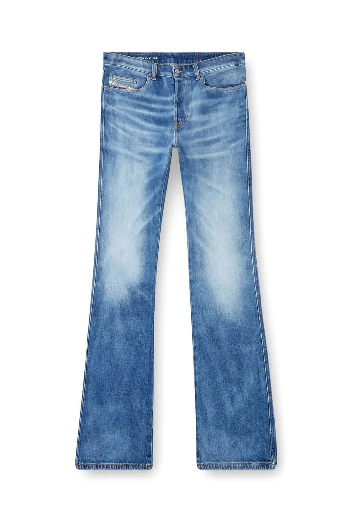 Bootcut fit with a medium waist, low crotch, and regular leg. The extra-long silhouette has a slightly flared hem and is detailed with an embroidered “D”. Button fly.